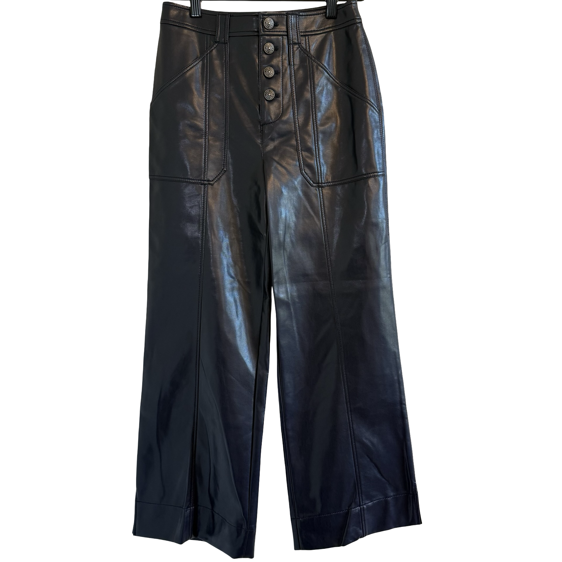 Cinq a Sept black faux leather high rise pants with button front closure.
