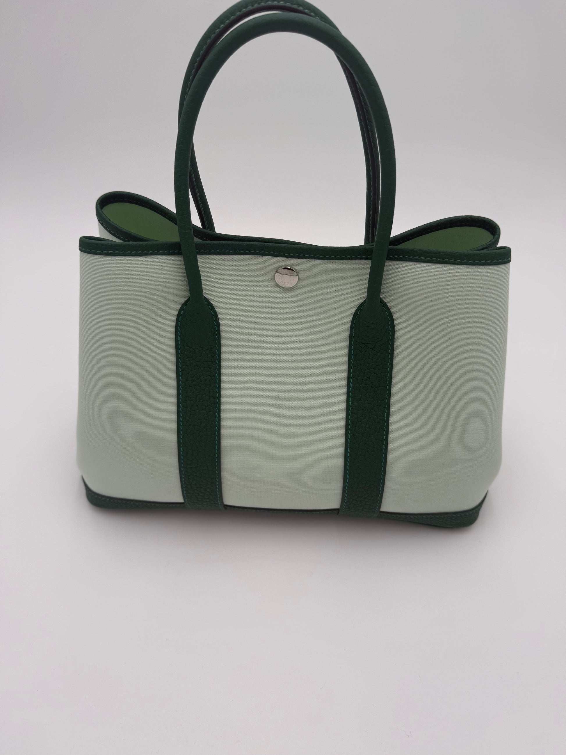 HERMÉS Garden Party TPM tote bag measuring 30 cm, crafted from durable ecru canvas with vert moyen leather trim and handles. The bag features a simple snap closure with palladium hardware. The interior is clean and the exterior shows minor signs of use consistent with careful wear. The canvas and leather are in good shape with no visible stains or damage.